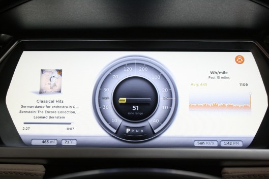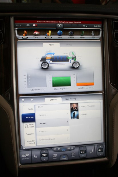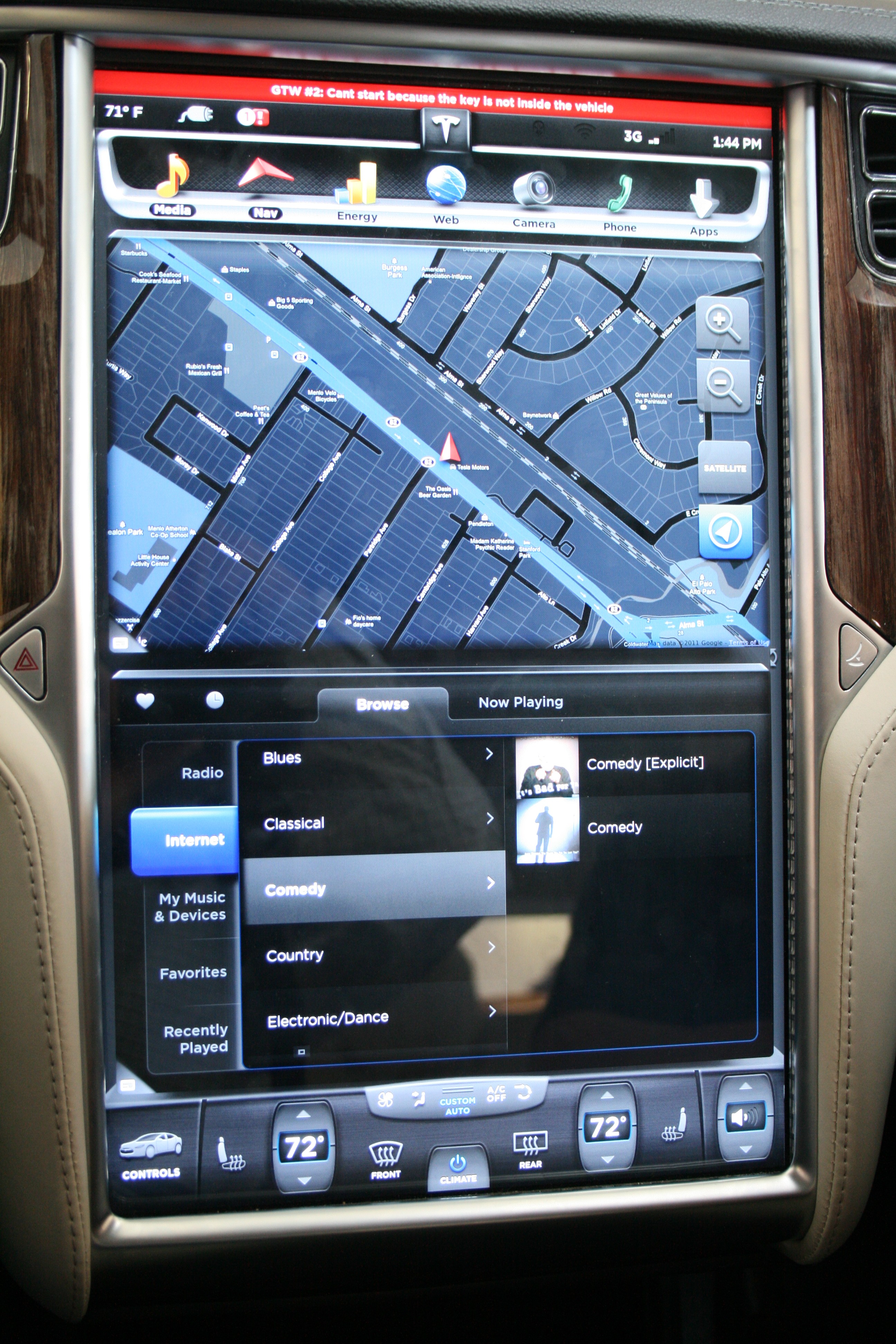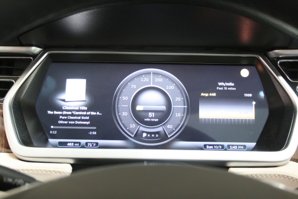 值得一提的是全液晶顯示的儀錶板屏幕,除了一般的顯示功能外,正在播放的影音資訊也會一併顯示於螢幕左方。同時也分日間以及夜間顯示,功能之多猶如一部智慧型手機一般。看來TESLA總裁Elon Musk獨特的思維已經在展現在Model S Beta版身上。