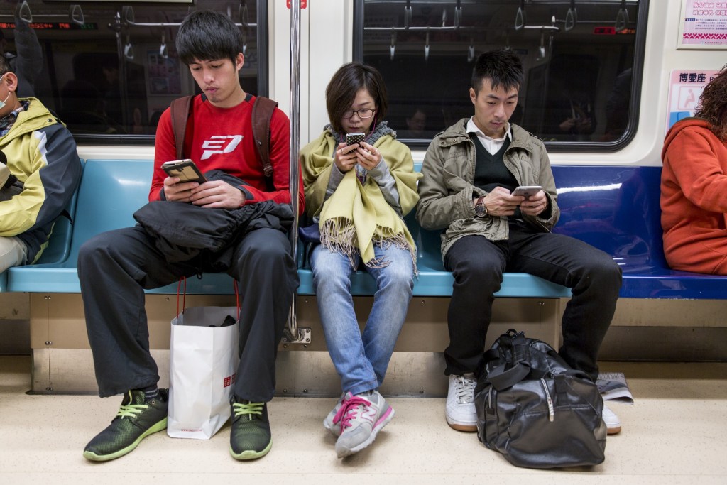 Friends on Phones Riding on Subway Train, Taipei, Taiwan Published 26 十一月, 2015 at 1024 × 683 in 在台灣的低薪風暴下,你我都是啃老族 Photo Credit: Corbis/達志影像