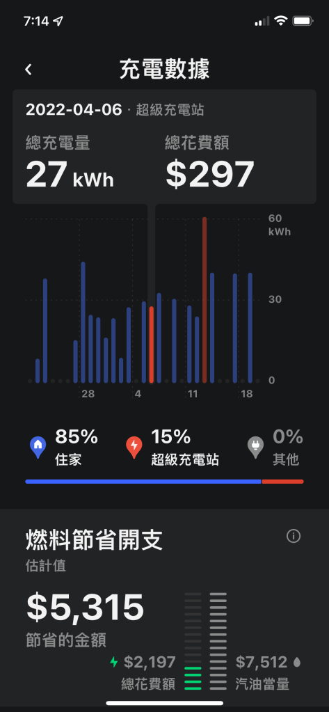 旅程中於高速公路上全程使用Auto Pilot行駛並且開啟冷氣,抵達朴子後仍有約60公里的續航里程。下午返程時,先至位於嘉義太保,全台目前最大的水牛城超級充電站(共有8座V2充電槍、9座V3充電槍,共17座TESLA充電槍,另外還有兩座PORSCHE的CCS1規格充電槍)進行充電,需時約20分鐘,再補充電量60kWh,並花費555元,隨後一路北上安然返回淡水家中。